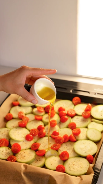 - Кабачок нарежьте на слайсы 0,5см по толщине, а томаты черри нарежьте пополам.